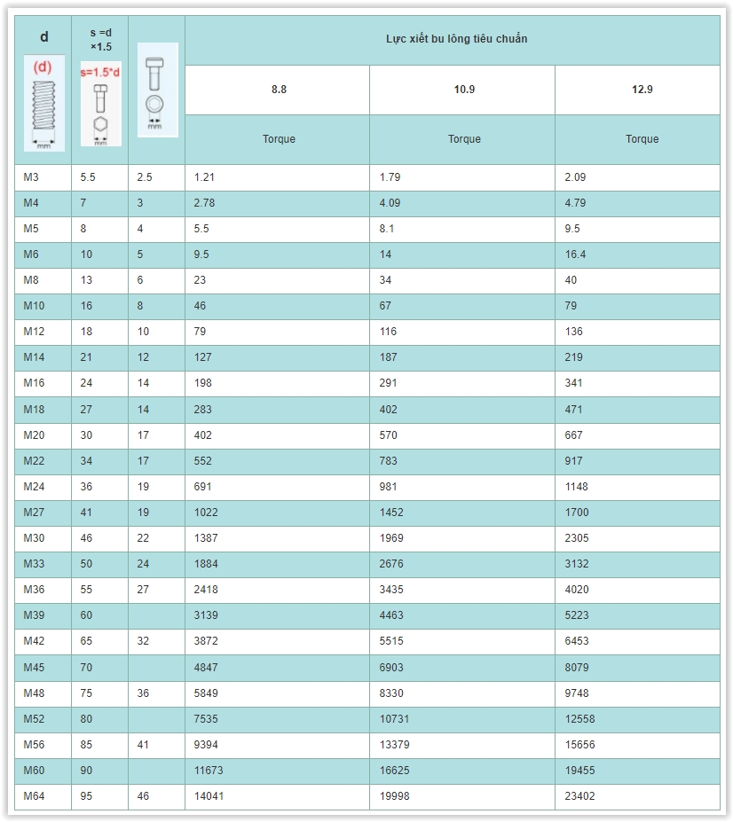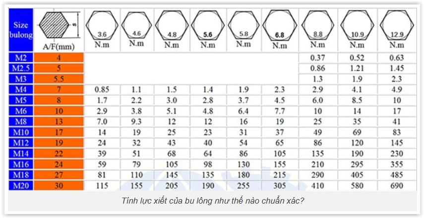 • Lực siết tối đa: 330 N.m (tham khảo thêm CÁCH TÍNH LỰC XIẾT CỦA BU LÔNG)